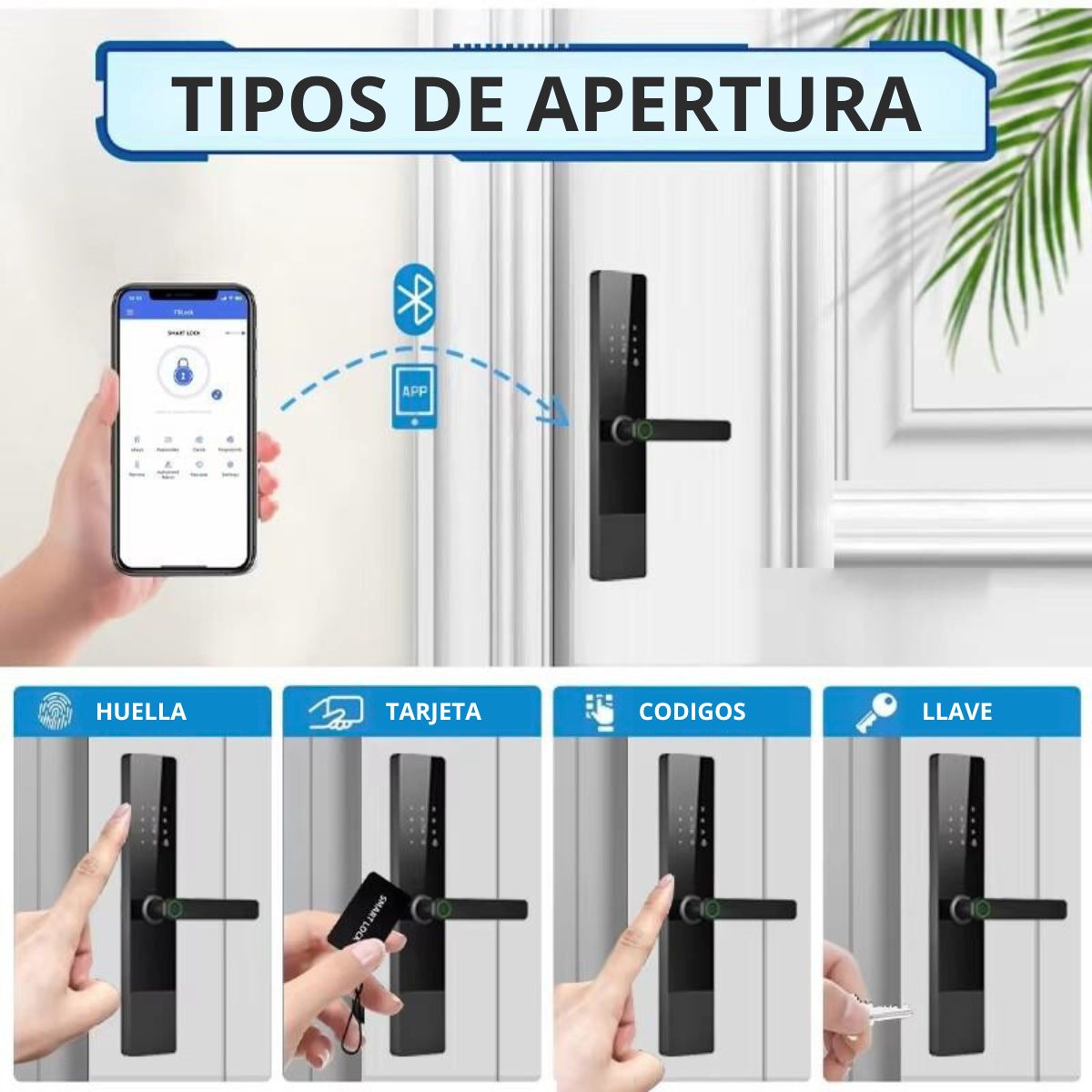 Abre con huella, app, tarjeta RF, contraseña o llave física, crea accesos temporales o permanentes y recibe alertas en tu teléfono ante intentos fallidos.